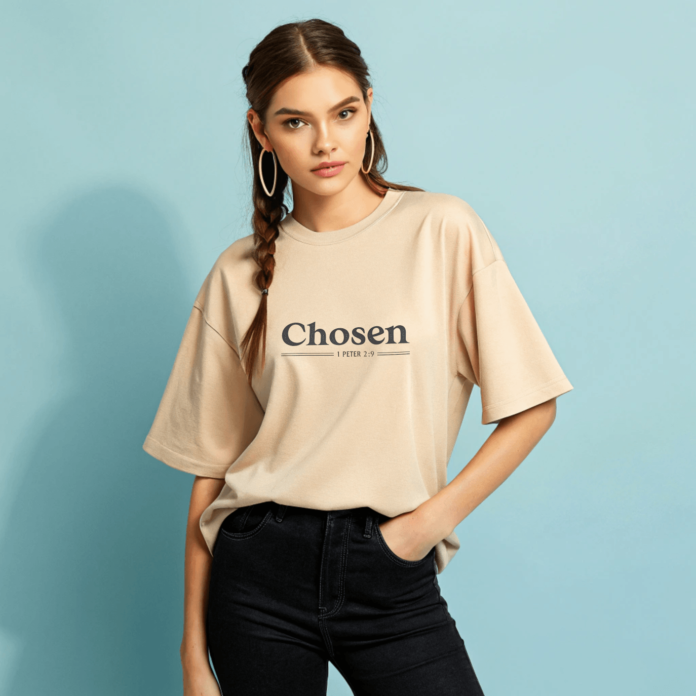 Step into your faith boldly with this elegant “Chosen” t-shirt, featuring the empowering Bible verse reference from 1 Peter 2:9. Designed in a soft beige tone with a clean, modern font, this tee is perfect for everyday wear, church gatherings, or simply expressing your spiritual confidence. The lightweight, breathable fabric ensures all-day comfort, while the timeless message reminds you—and others—of your divine purpose and worth. Whether styled with jeans or layered under a jacket, it’s a wardrobe staple for any believer.