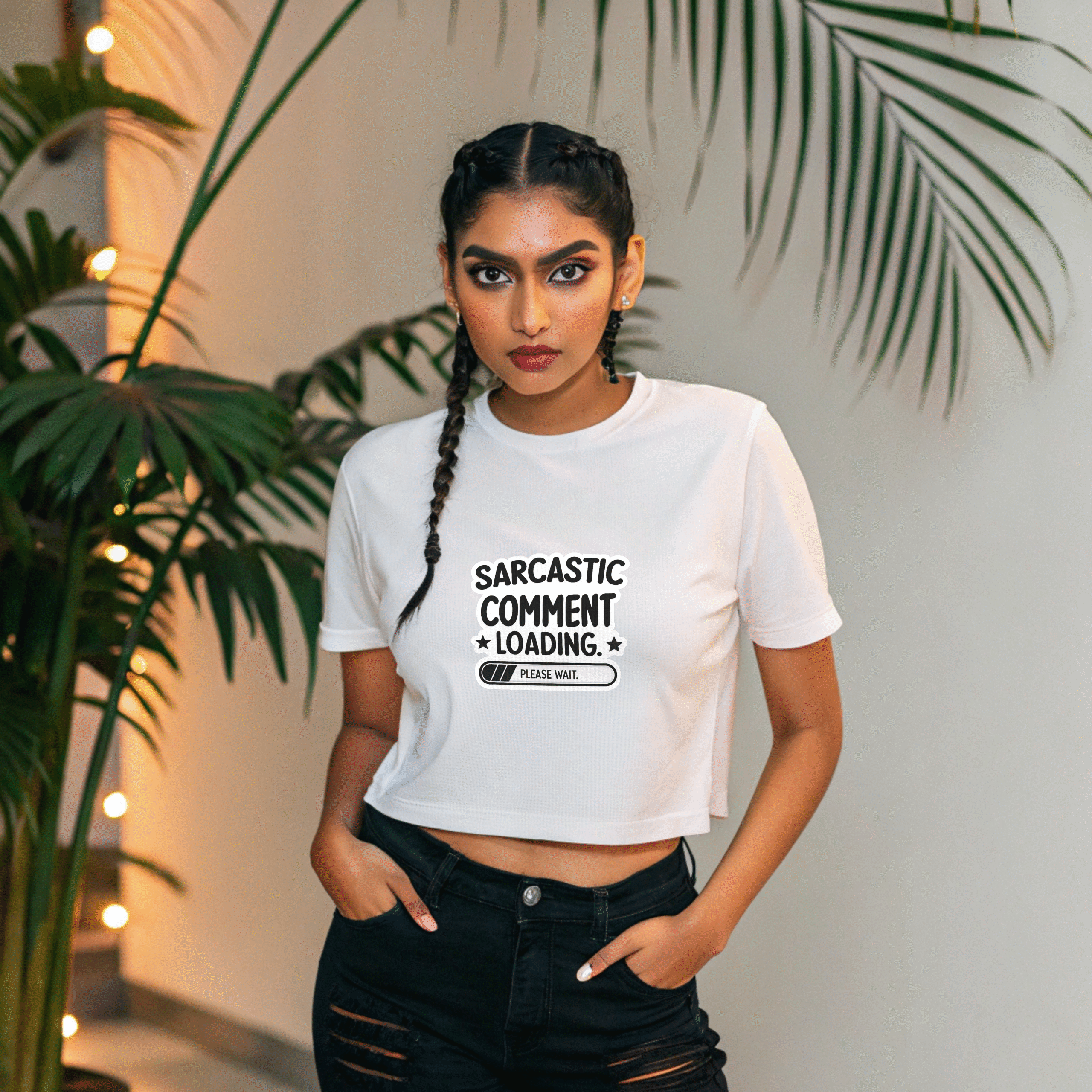 Add a dash of attitude to your wardrobe with this witty white crop top featuring the bold phrase “Sarcastic Comment Loading… Please Wait.” Crafted for comfort and attitude, this playful piece pairs effortlessly with high-waisted jeans or shorts. With its cropped cut and edgy design, it’s perfect for casual outings, fun get-togethers, or just making a cheeky statement. Braided hair, fierce makeup, and a confident stance take this look to the next level.